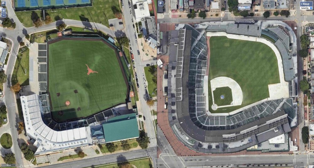 BTW, one more thing on Disch-Falk renovations ... here is a side-by-side same scale map of Disch-Falk and Wrigley. Obviously Texas will never need as many seats as the Cubs but you can see what is possible in almost the same footprint.