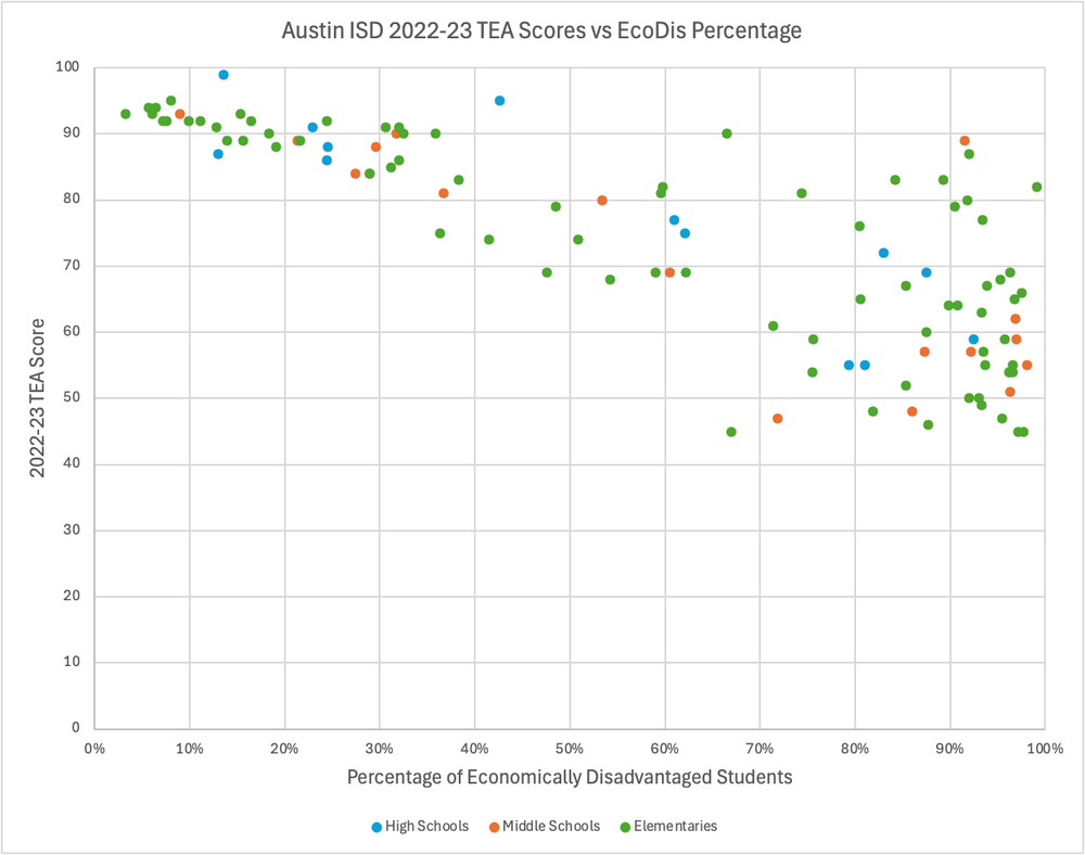 I was curious about eco-dis population vs TEA score, so I created this for Austin ISD from the TEA data. The TEA translates the score to A-F grades just like you remember from school, 90-100 is an A, 80-89 is a B, 70-79 is a C, 60-69 is a D, below 60 is an F. Five F's in a row means the school closes and/or TEA can take over the school district, and a school needs a C to break the chain of F's. What is TEA really measuring here? Seems like they are locking low eco-dis schools into an A/B score and locking high eco-dis schools into B-F with a chance of closure. This would be OK if they were using this data to try to help the bottom dots, but they are using it to close schools, force chaos with school mergers and take over school districts.