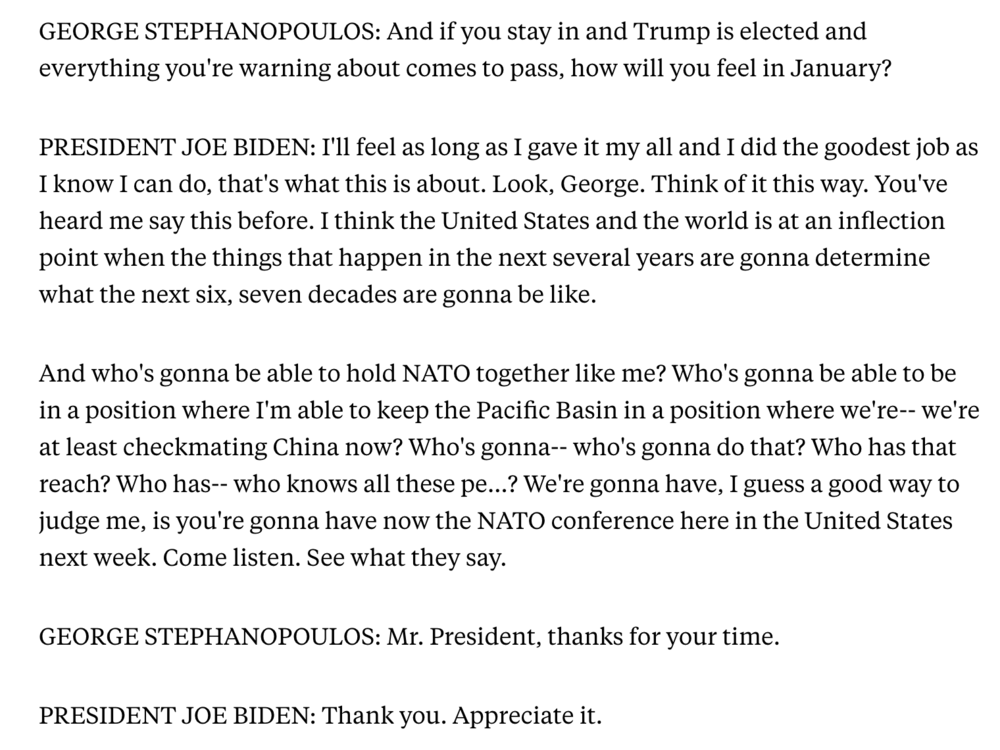 13. President Biden has a lot to be proud of. From an economic perspective, his industrial policy is spot on. Restoring our diplomatic image was masterful. He moved us away from the abyss. But it is time for him to withdraw with honor so he may be celebrated by Americans who care about this nation. I have no doubt he is trying his best to beat Trump, but unfortunately his best will not be enough.