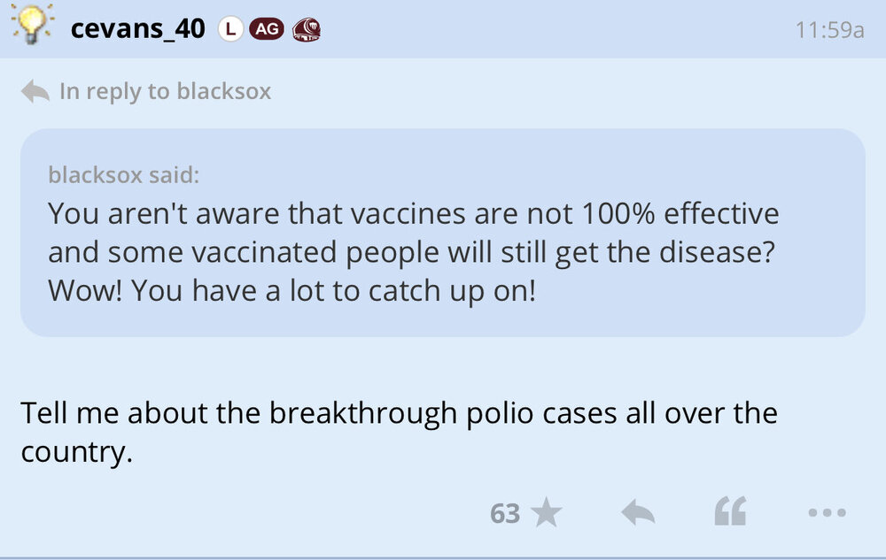 There have been hundreds of think-pieces over the past five years about the need for a common understanding of facts to have a social discourse, so I won’t go into that. But one can absolutely be comfortable in the conviction that another’s belief, perception or skepticism is incorrect. I’m not going to respect a person’s decision to deny the unanimity of modern medicine while they go to the fucking Tractor Supply and fight for the last of the apple-flavored horse dewormer. But more importantly, this ignorance (and that’s what it is) is the product of decades of misinformation by the conservative movement. You had, incredibly, never heard of Emmitt Till - do you know think the CRT thread would have gone differently if you had?