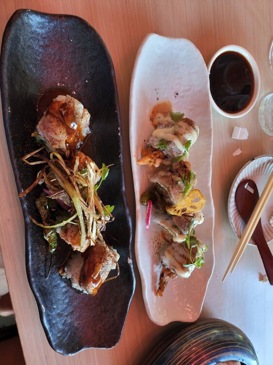 19. We parked on the street for free and walked 2 minutes into the restaurant. We booked early dinner reservations that morning and there were plenty of options for indoor/patio seating. Use the Resy app. Spa appointment at the Pearl wrapped up early, so we arrived about 4:30 and were seated immediately. Small space indoors with small tables and some sushi bar seating. Service was excellent (ask for Victor) so we tipped well and the bill was right at $200 for the two of us and we were well fed.