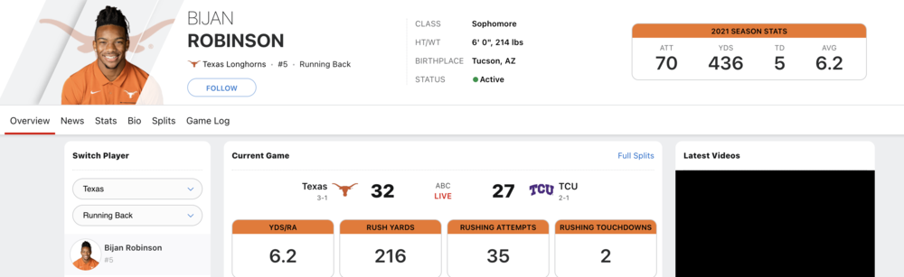 14. MY bad. Cut off a row. 652 yards after 5 games. No fumbles.