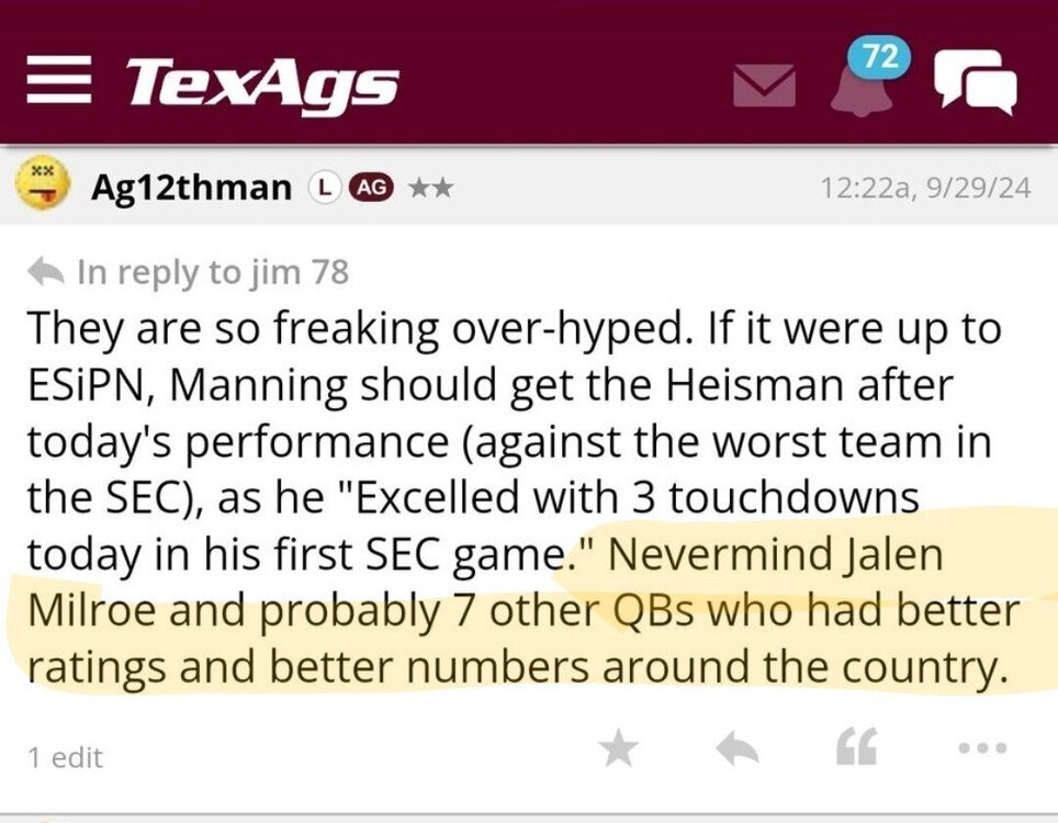 7. I knew this week would be a bit of a letdown, given aggy won and we won by "not enough." Pretty predictable, though still entertaining. I need to see the acrobatics ole Graham engages in to keep aggy above us if they lose to Missouri and we beat OU. That's when the real fun will start.