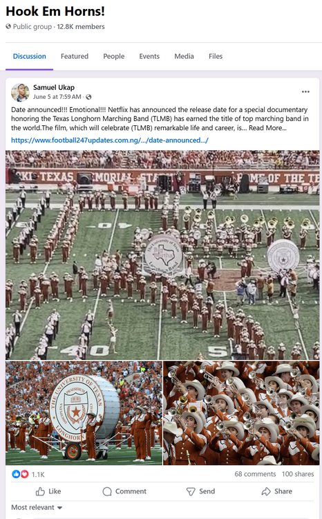 14. The "Hook 'Em Horns" facebook group. Friend of mine keeps reposting crap from them. Bunch of Nigerian based scammers posting false clickbait. https://www.facebook.com/groups/1483855825277910/ Reported it to Facebook numerous times, but their algos won't drill into the URLs to see the issue.