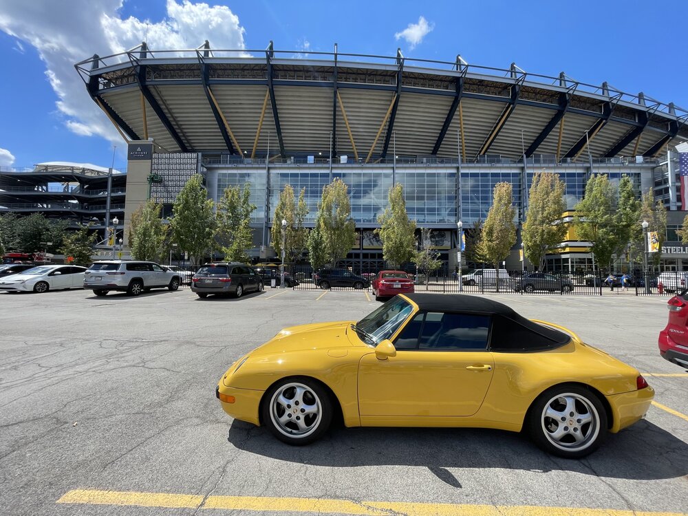 2. I have a Pitt helmet sticker on the passenger side, little triangle, window along with a Borussia Mönchengladbach sticker. It sure fits for a Steelers car but, no way in hell would I drive it to the stadium for a game. The Speed Yellow (official color) actually has a bit of the old mustard color Pitt had when we were always good.