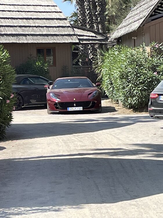 5. Drove back to Ettlingen from St Tropez yesterday. It is not a bad drive as there are a couple ways to go to avoid traffic. The main issue is avoid Lyon, at all costs. The best way is to just go down, as we did last year, past Geneva and stay then in extreme eastern France but, Bettina gets car sick so the mountain roads are verboten. Just yesterday saw four Alpine 110s. They are fantastic little cars. Saw a lot of Porsche 911s this trip. There are a ton of the huge luxury SUVs down there and all around. Saw a Rolls Cullinan (sp) as a hotel shuttle in St Tropez. At the resort there was a brand new Lamborghini SUV. They are interesting. The roads down around that area are awesome, if your passenger does not get sick on the twisties. Our car was her husband’s Q7. I did 725km of the 970km yesterday because I wanted to get a bit of speed driving in Germany. Then, after we crossed the Rhine, we had two areas of road construction. I did still manage to do a decent amount of speed, 131 mph, for about 30 minutes. It was fun. This Ferrari was at the resort as we were packing up yesterday the color was a reddish-rust metallic. Very sharp. Thursday back to America 🇺🇸