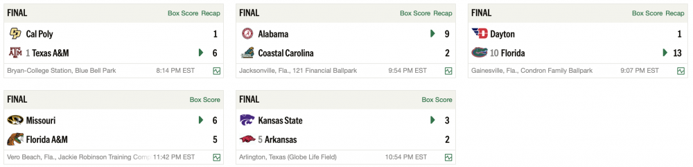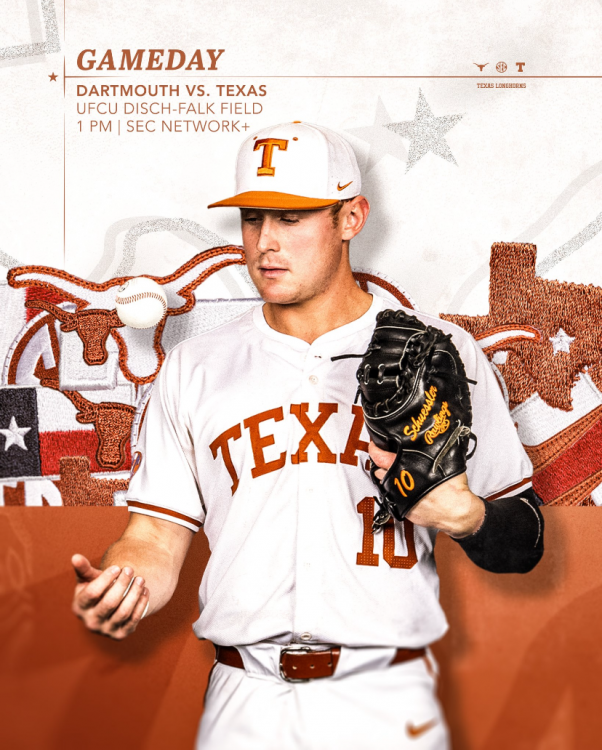 6. #16 TEXAS vs. DARTMOUTH Feb. 21-23, 2025 Where: UFCU Disch-Falk Field Time: Friday at 1 p.m.; Saturday at 12 p.m.; Sunday at 12 p.m. TV: SEC Network+ Radio: The Longhorn Radio Network Live stats: texas.statbroadcast.com PROBABLE PITCHING MATCHUPS FRIDAY – Dartmouth RHP Marco Dumsky (0-0, 0.00) vs. Texas LHP Jared Spencer (0-0, 0.00 ERA) SATURDAY – Dartmouth RHP Eddie Albert (0-0, 0.00) vs. Texas LHP Luke Harrison (1-0, 0.00 ERA) SUNDAY – Dartmouth RHP Nate Isler (0-0, 0.00) vs. Texas LHP Kade Bing (0-0, 27.00 ERA) It was posted yesterday, but note the above time changes.