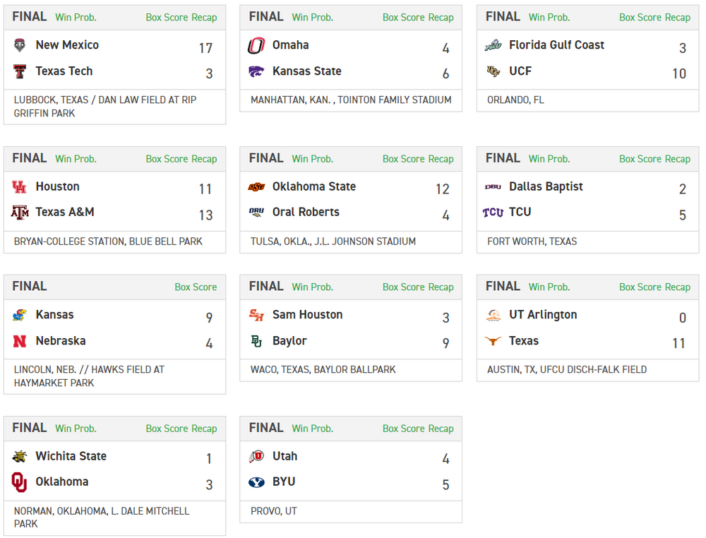 18. TEXAS (25-17, 11-7) at #18 OKLAHOMA (25-14, 14-4) Where: L. Dale Mitchell Park Time: Friday at 6:30 p.m.; Saturday at 4 p.m.; Sunday at 2 p.m. TV: ESPN+ Radio: AM-1300 The Zone/103.1 FM Live stats: Texas.Statbroadcast.com PROBABLE PITCHING MATCHUPS FRIDAY–Texas RHP Max Grubbs (4-3, 3.61) vs. OU LHP Braden Davis (4-3, 5.37) SATURDAY–Texas LHP Ace Whitehead (4-0, 3.32) vs. OU RHP Kyson Witherspoon (4-2, 3.72) SUNDAY–Texas RHP Lebarron Johnson Jr. (2-3, 5.03) vs. OU LHP Grant Stevens (5-0, 4.72)