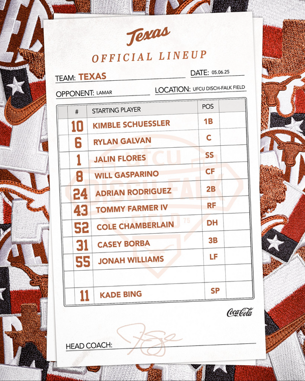 1. LAMAR vs. #1 TEXAS Date: May 6, 2025 Where: UFCU Disch-Falk Field Time: 6:30 p.m. TV: SEC Network+ Radio: The Zone AM-1300/103.1 FM Live stats: texas.statbroadcast.com PROBABLE PITCHING MATCHUP TUESDAY – Lamar RHP Carter Sutton (5-2, 4.68 ERA) vs. Texas LHP Kade Bing (3-0, 2.91 ERA)