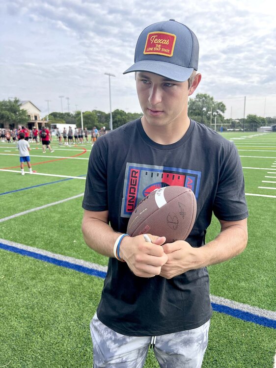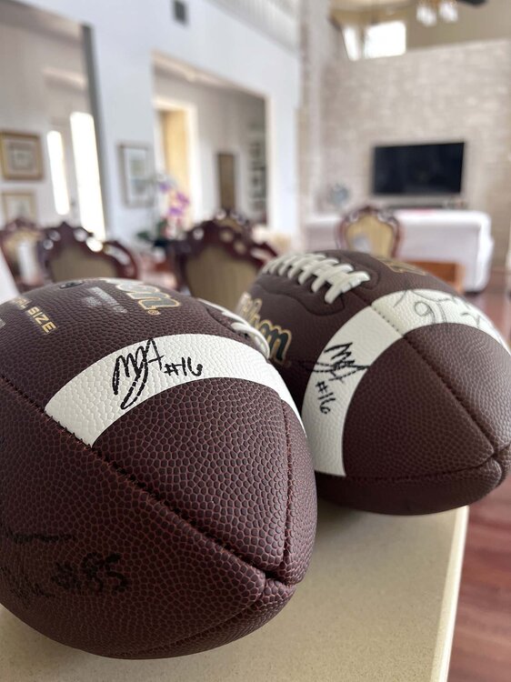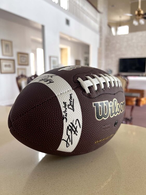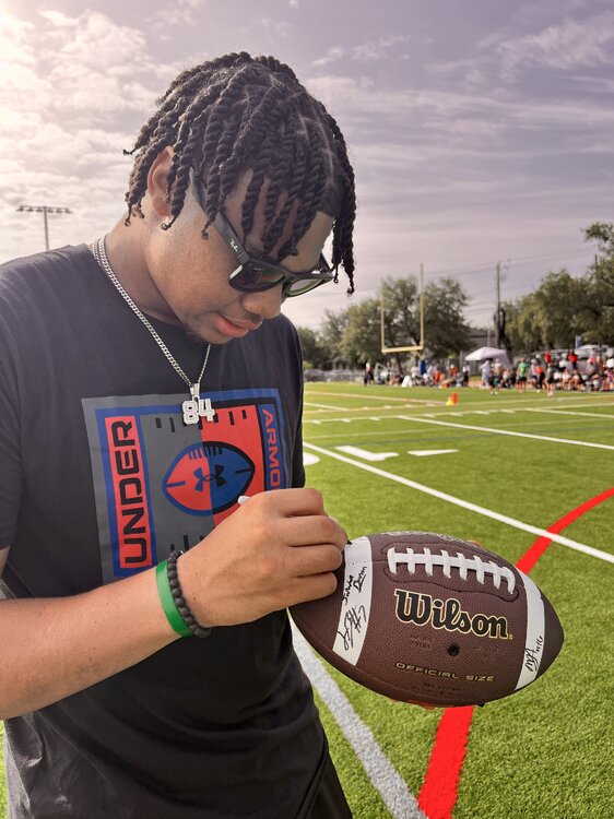 Okay, my beautiful friends, I have some fun news that is...fun. I got to hang with Michael taaffe and Jordan Washington today as they participated in a summer football camp. And yes, the Sacred Surly football made an appearance. The camp was free, so kids who didn't normally get a chance to participate in training got great access. Michael was awesome. He is very excited about this season and he wants to go pro. The most interesting thing that he told me that the training and discipline that he learned as a very young player were the tools that helped him rise from a 0-star college walk-on to a starter at his dream school and he is fully committed to having success in the pros. He is very charismatic and the kids loved his energy, easy laughter and kindness. He demonstrated drills and he, Jordan and the other coaches were very engaging. It was fun talking about his magnificent INT vs Quinn in the state championship game, probably the best INT I've seen live. I wished him health and success in his ultimate goal. My beautiful wife made Michael sign a Westlake hat. Michael knows Surly Horns, haha. Jordan was another one. He's very easy-going and full of smiles. Dude is large and solid and very nimble. He is excited about his opportunities this season. He really connected with the kids, and was even tying kid's shoes. He is a gentleman and a good person. I am excited for him this year, and wished him success and health, of course. The glory of the Sacred Surly football continues to grow and it is getting close to the delivering it to @immamac . I would be really happy if he just keeps it, cause he deserves it for creating this amazing site. But if he wants to auction it off, so be it. I talk a lot of crap and post a lot of stupid stuff, but love this community and all of you. When I purchased the balls for Quinn to sign, I had no idea this project would grow and now look at the signatures: Quinn Ewers Arch Manning Michael taaffe Jordan Washington Quintrevion Wisner Jahdae effing Barron Isaiah Bond Gunnar Helm Cheers,