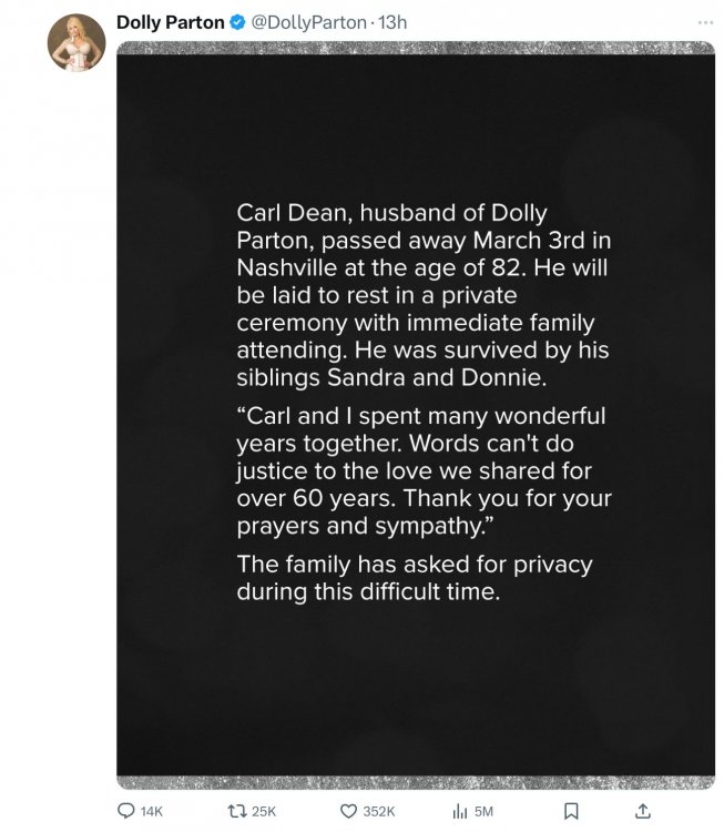 4. A 60 year marriage is a beautiful thing. I agree that she’s a national treasure. The stage of life when one’s spouse dies of old age is so bittersweet, I watched both my parents (dad died first) and my in laws (MIL died first) go through it. Prayers for Dolly. And now she’s single. Just sayin’.