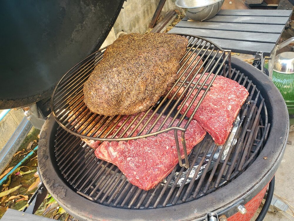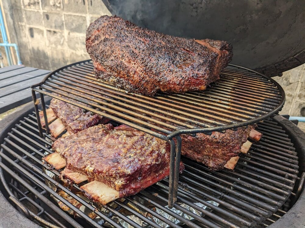 Seasoned each one a bit differently. Brisket was salt/pepper topped with more pepper (Little Miss Dalmation mix, with more Rudy's pepper - I find Dalmation too salty alone). Galician ribs were Spanish coarse sea salt only, keeping it pure to the breed and to the country. One Angus rib was Montreal steak seasoning, the other was Cajun Two Step topped by more Rudy's pepper.