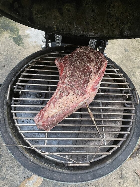 Expander rack outside ring is hotter as the heat comes around the deflector and wraps up the dome, but is cooler than main grate as it is further up and the food around the lower layer blocks some heat. No radiant heat from deflector, this is all convection hot air, probably lower 300s in temp. Chicken leg quarters.