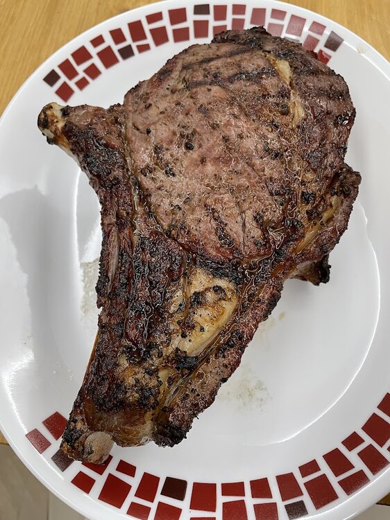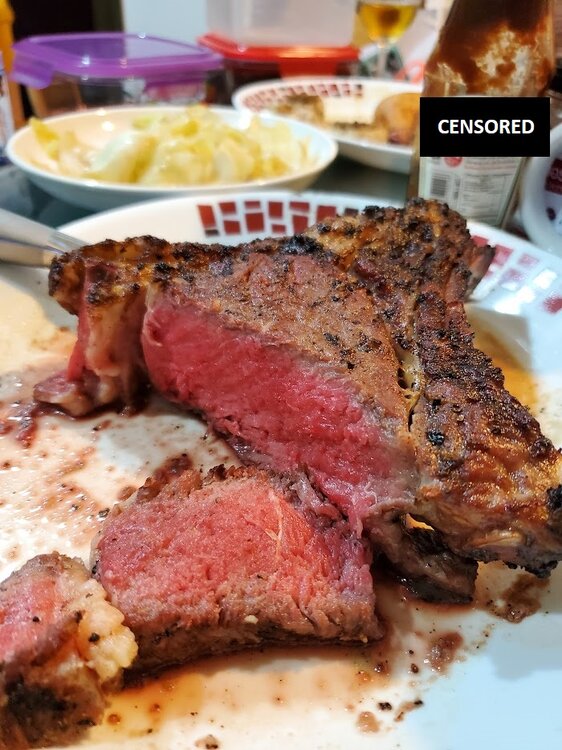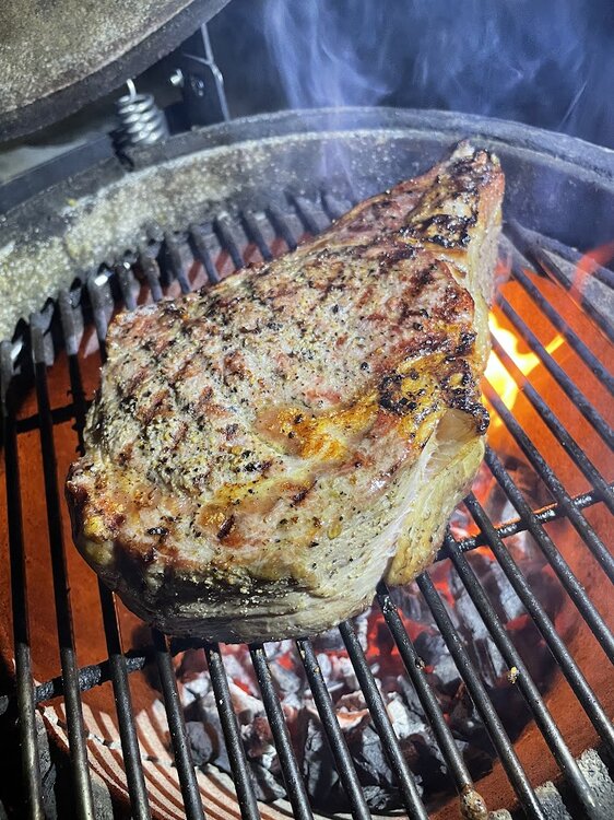 Main grate center section, pork steaks, get more radiant heat off the deflectors while keeping drippings from falling down into fire. Ran this area around 275F. Being close to deflector, the bottom sees direct radiant heat from the deflectors so does cook quicker. It's similar to lower temp direct grilling here, just with no flames to flare up underneath.
