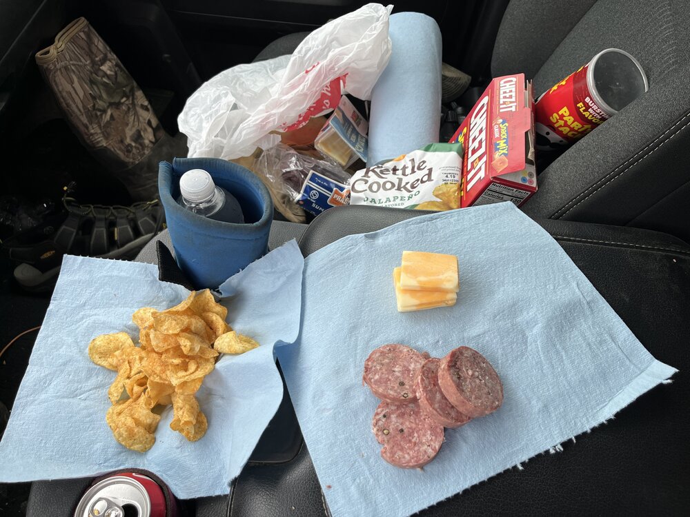 Prasek’s summer sausage, Colby Jack cheese, jalapeno kettle chips, and a coke knocked back the hunger pretty good. Blue shops towels because I didn’t have anymore Whataburger napkins.