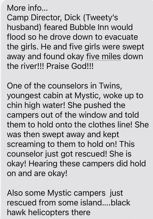 10. Wife update: Still 4 girls unaccounted for from camp mystic. The fact they are all from the youngest cabin turns my fucking guts in knots. I can’t imagine what these girls’ parents are going through.