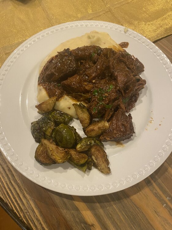 18. Braised Venison Neck Roast with mashed potatoes and roasted brussels