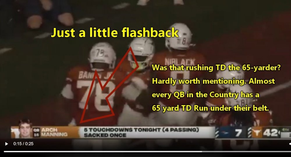 It seems to me that there's a very good argument to be made that there's no way Texas, with Arch taking half of the snaps against Georgia (with an "Arch Gameplan", of course), would have done any worse than the meager 16 fucking points that Ewers put on the board in Regulation. We probably would have fared a little better with him getting just half the snaps, maybe a lot better. Therefore, there's an even stronger argument to be made that Arch should get half the snaps against Clemson, so that he can be ready to take on whatever comes after Clemson, because there is zero chance that Ewers can win the big one - zero - and that we absolutely have to get Manning into the game ASAP and not just for a couple of plays (for Christ Sakes). Only Manning can take us to the promised land. He needs to play at least half of the Clemson game, goddammit. -
