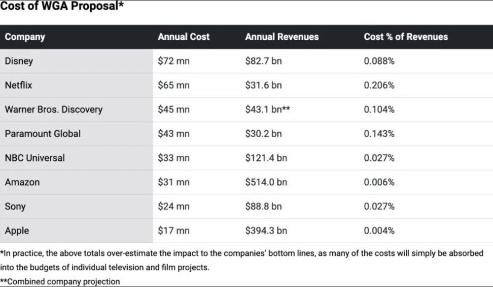 WBD announced today they could lose upwards of $500m this year on the dual strikes, after bragging last earning's call that they'd saved $100m. Fun reminder that the WGA estimates the cost to WBD to agree to the writers' terms would be $47m PER YEAR. https://deadline.com/2023/09/warner-bros-discovery-earnings-hit-hollywood-writers-actors-strikes-1235536463/