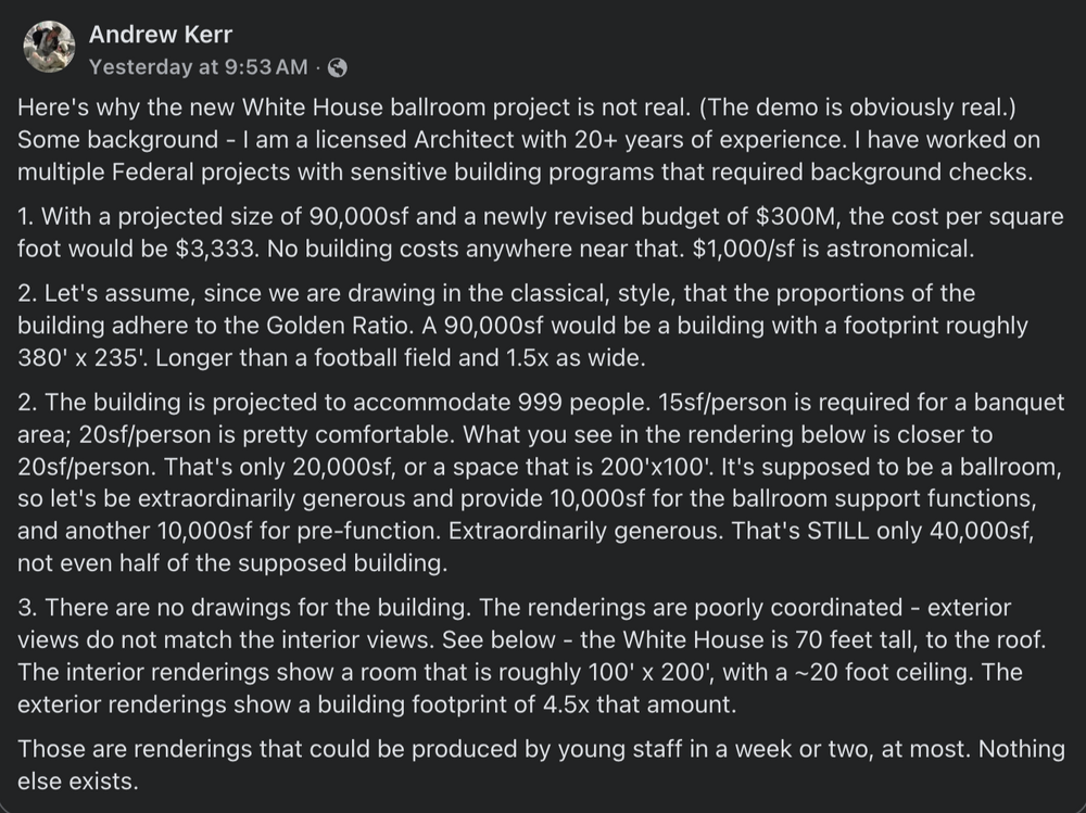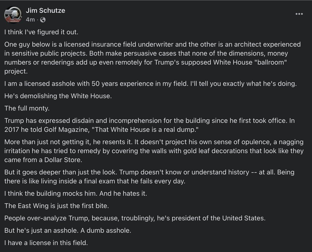 18. Jim Schutze is a longtime Dallas (retired) newspaper columnist who has been known to rabble-rouse about local politics. Here's the post he's referring to. There are homes in Dallas that cost $1000/sf or more so that isn't an immediate red flag to me. But I do wonder a bit about what Jim said above -- Trump thinks the White House is a dump. I'd forgotten he said that. Wouldn't be completely on-brand for him to want to build some kind of presidential palace that would rival those he's no doubt fallen in love with in the Middle East and Russia?