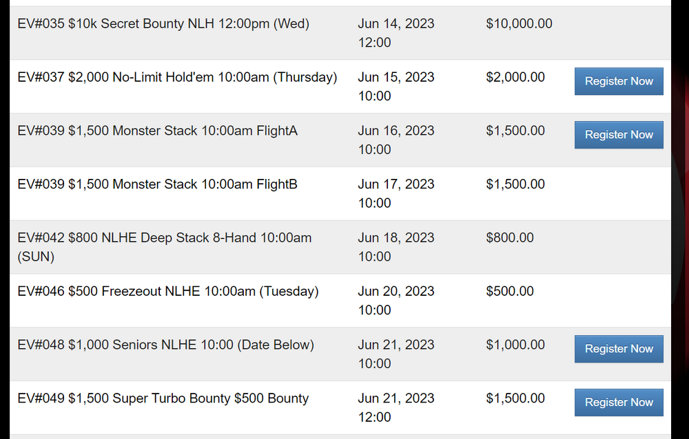 10. I'm going June 16th-23rd, playing in the Big O and the PLO8/O8/BigO tournaments. What's weird is I went to register and they aren't on the page. They are events 41 and 45 and the registration page just skips them
