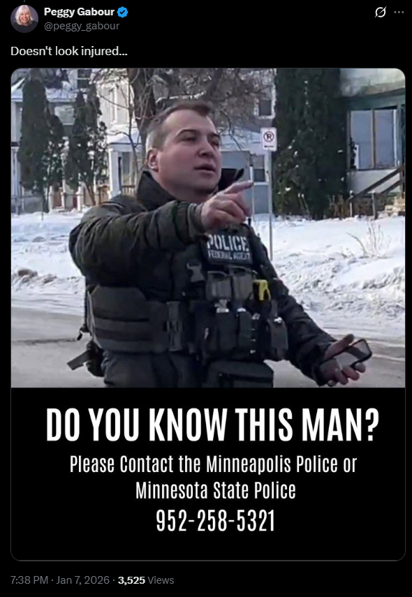 In the NYT analysis of the videos, I just noticed one thing they got wrong. After Good's vehicle hits the parked cars, he says that "a bystander runs toward the collision". That wasn't a bystander. That was Renee Good's wife. She never got into the car.- Minneapolis ICE Murder