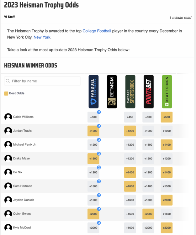 8. Caesar's has him tied for the 6th best odds for winning the Heisman. And you know that Sportsbooks are known for their legendary sip bias.