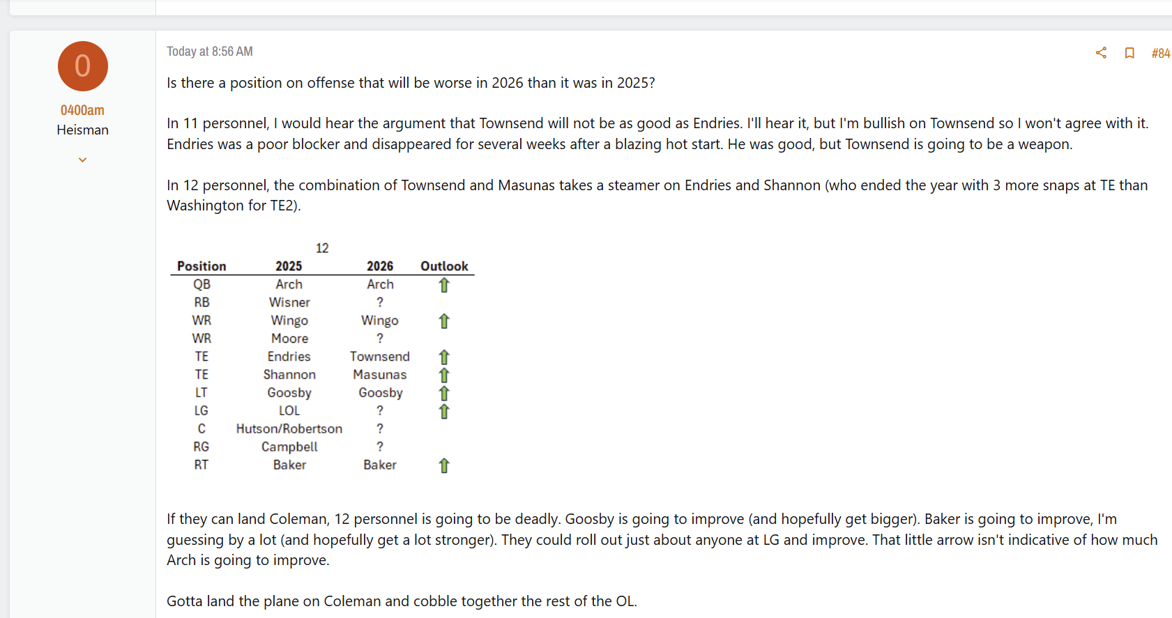 I liked Endries, but pretty much half his season production came in 2 games (San Jose State and A&M). In-between those games he went: 1 catch/4 yards 2 catches/2 yards 2 catches/4 yards 1 catch/ -1 yards 4 catches/25 yards 3 catches/24 yards 3 catches/9 yards 2 catches/49 yards And he was never a great blocker. I don't think you have to squint too hard to envision Townsend being able to step into his role and provide at least the same level of production.- Transfer Cycle 2025-2026 - Please Make It Stop