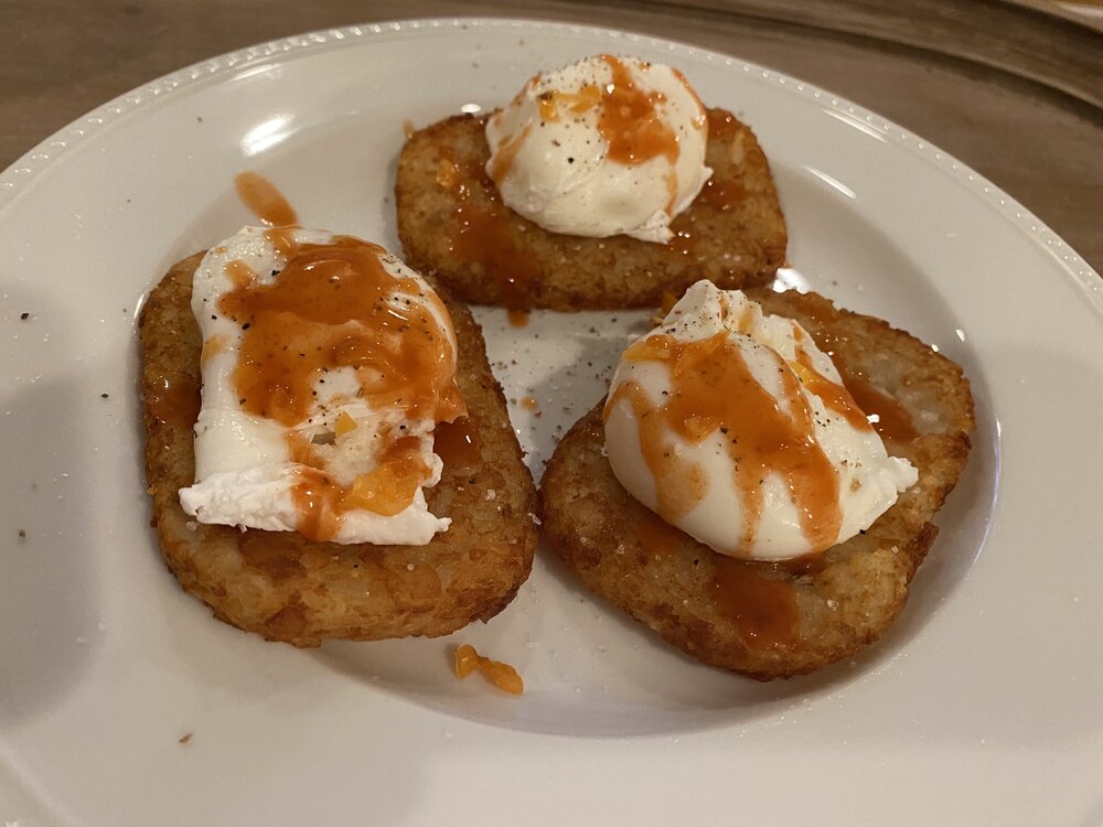 2. Poached eggs on Kroger frozen hash browns. Dash of Frank’s and some fresh habanero. Nice little Monday night.