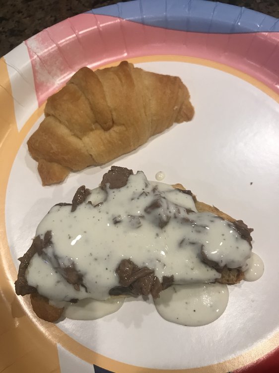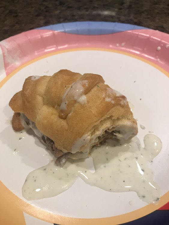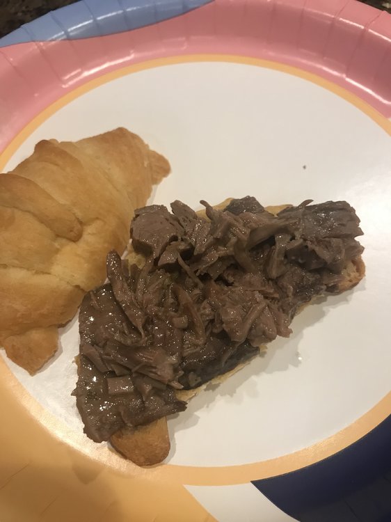 11. Needed a snack. Found a croissant and leftover pot roast with a touch of gravy. Not enough flavor, so hit it with a dash of ranch dressing.