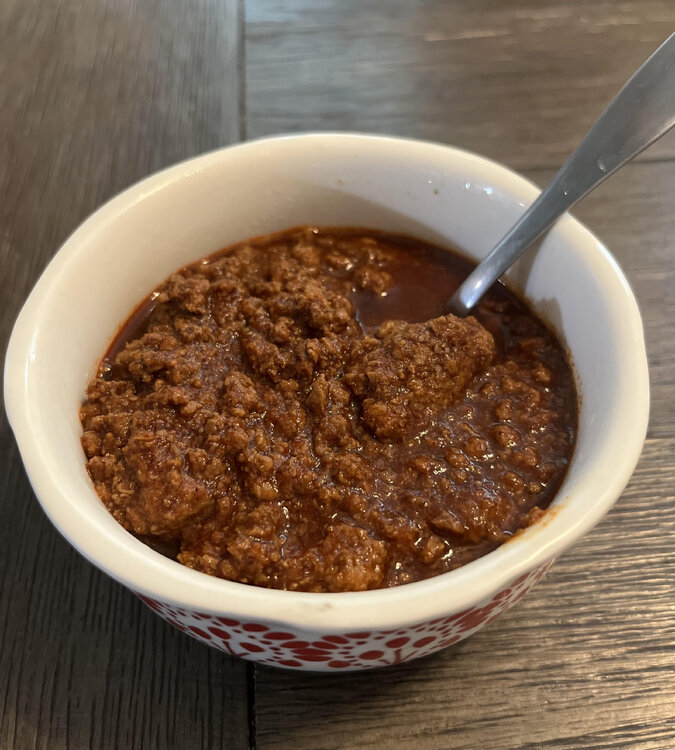 7. Threw down on a pot this weekend trying to dial in a competition recipe, using some powders from Mild Bill's. 3lbs beef, half chuck/half flat, ground on a 7 plate and cooked in balls before breaking down later. The flat and chuck didn't have as much fat as I would have liked, and you could for sure taste a bit of the dryness. Thinking I'll just go back to all chuck, and maybe shorten my cook time a bit. The flavor, though, was pretty spot on. Maybe gunna tweak the heat a bit, but I was pleased with this one. (bigger chunks are about a bit larger than quarter-sized. The bowl is small (more like a salsa bowl) and spoon not very big either, so makes the chunks look bigger than they are. Dunno why, but I always grab that bowl to test out the chili)