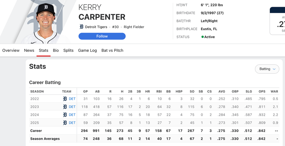 4. That's an interesting way to describe a major league baseball player who just become the first Tiger to hit three homers in a game since 2016 haha. For the uninitiated, she's married to Detroit RF, Kerry Carpenter: