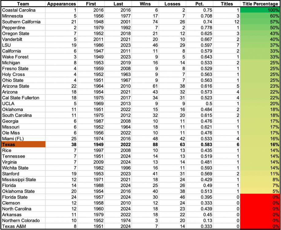 12. Cross-posting from another thread for conversation - I decided to go down a historical rabbit hole: Sorting by title percentage, LSU's rate is impressive for a team that's been there 19 times For teams that are still annually relevant, Vanderbilt and Oregon State have very good title rates, but their overall appearances aren't very high At least we're not aggy (see very bottom), or FSU, for that matter Thank God college baseball is back! Let's go get number 7! Note: not every team with a CWS appearance is listed, but all with a title are. Teams at the very bottom have the most appearances without a title (in descending order)
