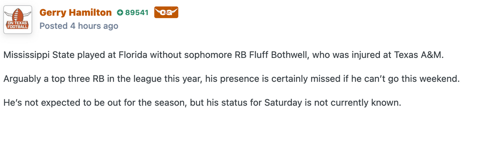1. Bobby: Injury news incoming. More later. Per CJ Vogel (Tuesday 5:15 PM) Hearing Georgia is the targeted return date for Taaffe from his thumb surgery. That would mean he would be sidelined for Mississippi State and Vanderbilt, then have the bye week to get back to speed for UGA in Athens on November 15.