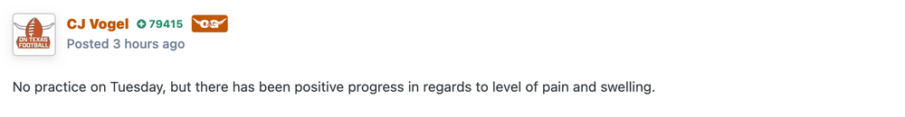 Friday By Bobby Burton Oklahoma quarterback John Mateer was upgraded to “probable” last night. That decreases the chances of a Longhorn victory IMO. But it simultaneously increases the odds that the Longhorns are going to be pushed to fight as hard as they can on every play. That they’ll play with an unbridled passion and focus. Unfortunately, we haven’t seen a level of consistent focus and passion this year. Maybe this game, maybe Mateer, shakes the cobwebs loose. ** I hope folks realize the indictment of what I wrote above really is. Right now, this team is not playing well on a number of levels. The offensive line looks lost against pressure. The interior defensive line is not getting much of a push in the pass rush. And the offense seems to lack the punch it had a year ago. ** The bottom line: We need to see something different in the Cotton Bowl tomorrow. If that game doesn’t get you amped up and focused as a team, then you may not have a pulse this season. ** Despite Mateer, I’m still picking the Horns. I have faith that the Texas defense will come to play, and Sark and Manning will find a soft spot - at least enough of one - somewhere in that OU defense. Hook’Em! ** (Added from Thursday Night) No change for the Texas Longhorns on their Thursday evening availability report. CB Malik Muhammad and WR Parker Livingstone remain PROBABLE. RB CJ Baxter remains DOUBTFUL.