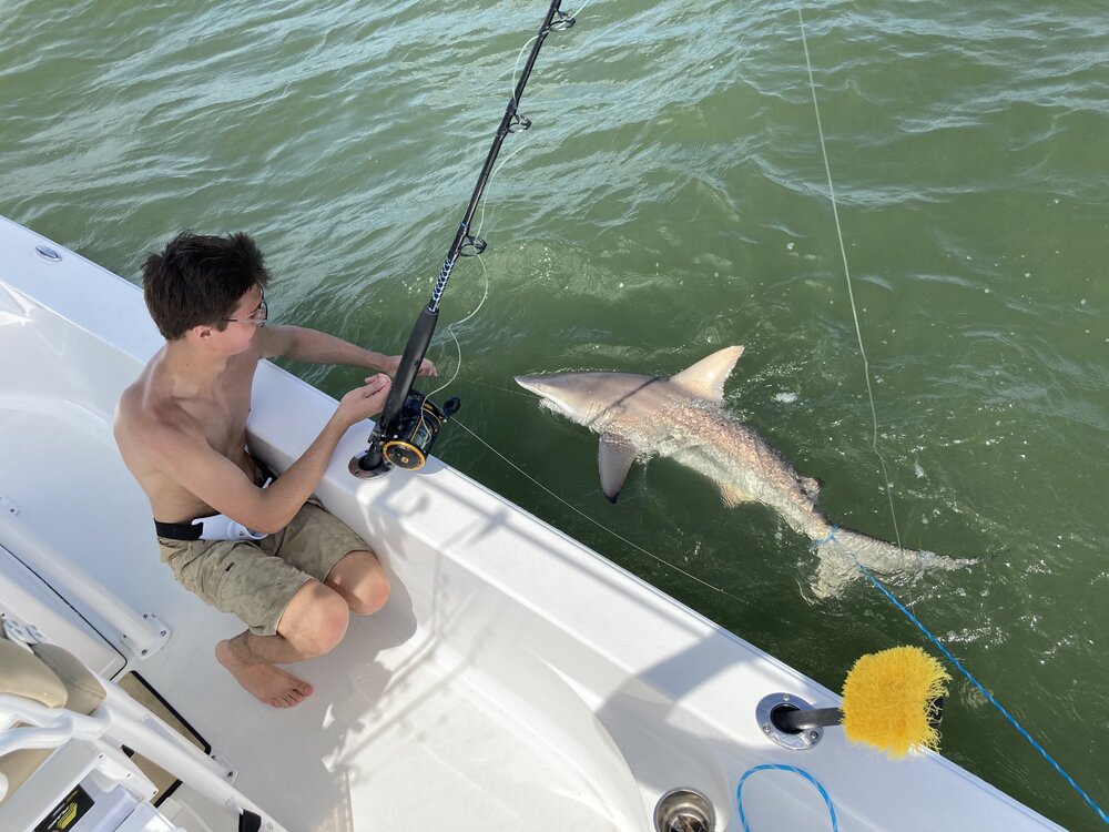 6. Took the boy out to cruise the beachfront in search of sharks and bulls. Tried right in front of Pleasure Pier first and caught this old warrior. Notice the love bite on the back end. moved on out a little ways to drift behind a shrimp boat and had a double hookup pretty quick. Mine got off but his stayed hooked for a good 30 minute fight. We kept chasing the shrimper but never got another hookup. Started getting a little bumpy so we headed back in. Good afternoon and the boy got his pb shark so far.