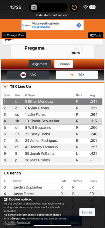 2. Belyeu is standing in the box and taking live pitches, don’t think he is swinging yet. Read that Schloss said he could possibly (albeit a small chance) play against OU if everything progresses with no hiccups. Good to see that he is progressing along the timeline that they have had since the beginning