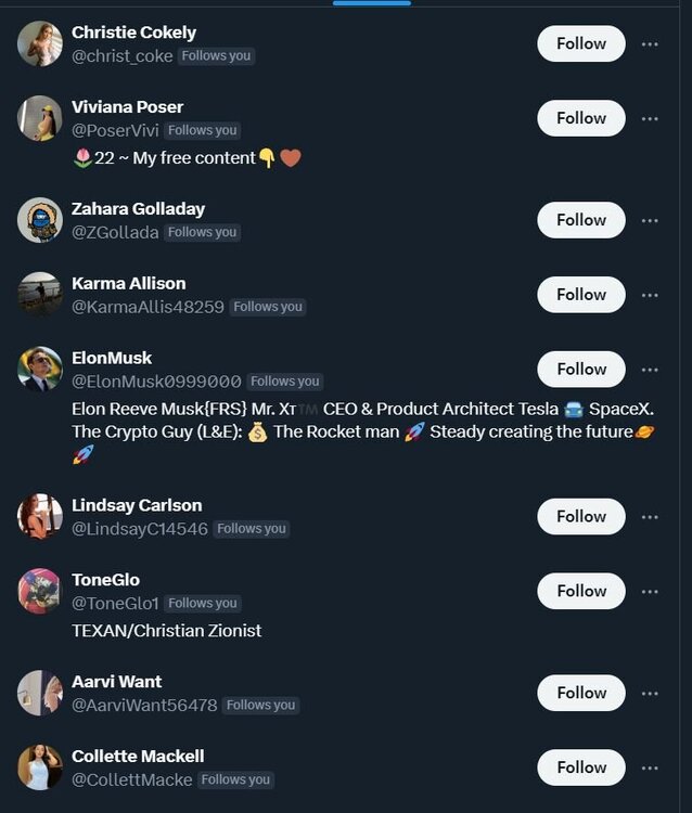 I see that Elon has been bragging over the number of users/visitors Twitter has had recently.  Here's something really interesting --- a list of my 10 most recent followers.  Why are my followers interesting? If you click on the profiles of almost all of them 1) They are following between 3,000-7,000 accounts 2) they have roughly 100 followers 3) they have ZERO posts.