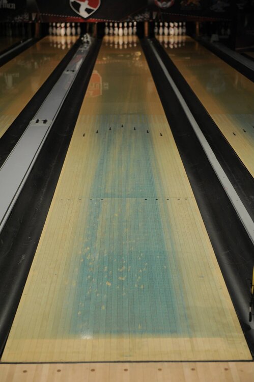 Speaking of balls, where do they factor in to all this? Performance-level balls are actually pretty porous. Scuffing with 360-4000 grit pads or polishing can make them more or less so. The ball wants to dig into the oil and grip the lane in order to hook into the pins. In doing so, you will notice oil rings on the ball after every shot. Each shot picks up a tiny amount of oil. That's why people wipe off their ball before every shot. If you throw enough shots in the same spot and pick up enough oil, your ball is going to start hooking more. This is called transition of the oil pattern. When you see this start to happen, you have to adjust. There are 39 boards on a lane. We talk about adjustments in moving your feet or your target in terms of boards, ie. I might move my feet 2 boards left and my target 1 board. In the last few years, the PBA has been putting dye in the oil on TV shows so you can kind of see what they're bowling on and how it changes. Every ball has a different surface manufactured at a specific aggressiveness for different lane conditions. Figuring out which ball to use and where to aim with it is necessary to throw strikes. In addition, the cores of balls are very different and can be made to help the ball hook sooner, later, more, or less. Where the holes are drilled can also have an effect. If you could see the center of gravity (CG) of a ball as it's rolling down the lane, it would be wobbling. Balls are meant to be drilled off of it's stable axis. As it's rolling, it's looking for that stable axis. It's storing the energy you put into it until it hits that stable axis, ideally as it hits the part of the lane with no/less oil. It then hooks hard and hits the pins with more power. Think of it like hitting a wedge with with a bunch of backspin. Nothing happens when there's no friction (golf ball in air, bowling ball skidding through oil), but the instant it hits friction, both are going to go the direction of the spin. These other 2 things (getting lined up with the right ball/target and understanding, managing, and even anticipating transition) are just as important, if not more so, to high scores as being fundamentally sound with your approach. First image is a shot of the blue oil after a TV show. You can see the shape it started out as, but also where the traffic was and the oil is worn out. Next is what a high-end ball looks like after it goes down the lane. The wobbling CG causes the ball to flare as it's rolling, thus giving a fresh surface on every revolution. That's all I can think of now. Happy to entertain any questions or comments.