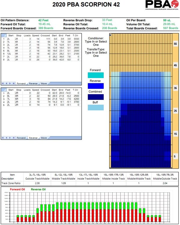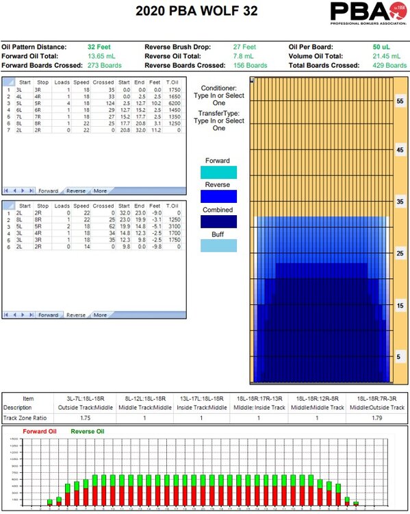 Alright, here we go. You see people step across the foul line and immediately slip and fall on their ass, right? That's because of the oil applied to the lane to protect the surface. How and how much oil is applied is what determines the playing conditions. These are called oil patterns. Between the 2-D lane surface and the volume of oil and any one spot, you can envision a 3-D image of the conditions. In a typical league oil pattern that every center puts out every day, you have very little oil applied near the gutters. This makes the ball hook back if you throw it out there and increases your chances of a strike. Conversely, there is a high volume of oil applied in the middle of the lane. So if you miss your target left, your ball is going to skid more, hook less, and increase your chances of a strike. You can see how this gives you a greater room for error and makes it easier to throw strikes. In professional conditions (often referred to a sport conditions), the oil is spread out more evenly, giving you less room to miss right and get the ball back as well as less room to miss left and have the ball hold and not hook. Let's take a visual look at this. The "Chris Paul" is what a typical "house" oil pattern looks like. This one is 42 ft in length. You can see at the bottom that the outside zone ratio is 8.46:1. That's the ratio of oil in the middle of the lane to the outside of the lane. Any ratio greater than 8:1 is considered pretty easy. They used this in the Chris Paul Celebrity Invitational. The "Scorpion" is the same 42 ft length, but you can see the difference. The ratio there is 2:1, and this is something used in an actual PBA tournament. The majority of house oil patterns will be 40-44 ft in length. Sport conditions can be anywhere from 32-52 ft. The length of the pattern has a major effect on where you have to play in order to throw strikes. For example, look a the 32-ft "Wolf" pattern. You're going to have to play straighter and flirt with the gutter if you want to strike because the oil is so flat across the rest of the lane. Next up, I'll discuss bowling balls and what they do to these oil patterns.