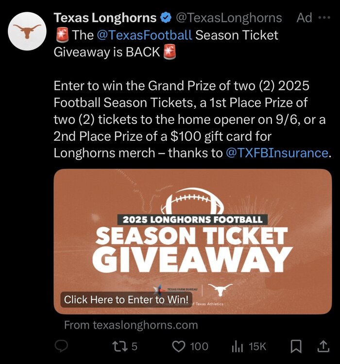 14. Texas Football is now buying ads for ticket giveaways on Twitter/X.