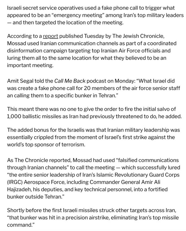 Add this to the steadily growing pile of "Mossad is scary"... The level of penetration Mossad has into the Iranian day-to-day operational intelligence is insane.