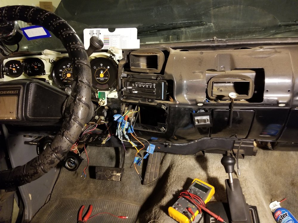 K5 update...   Like I mentioned earlier, the previous owner rewired the entire truck it seems.  Whenever a gauge would stop working,  he'd just install a stand alone gauge separately.  So what I've done is ripped out his extra aftermarket gauges, and got the OEM oil pressure gauge working again thanks to a new sender, and at the same time, replaced the entire cluster with a cluster from a '79 with a factory tachometer.  The factory tach was an option from 77-81 and they are extremely hard to find.  This allowed me to rip out the aftermarket tach.  It took a little modification to work, but it wasn't too bad.     The previous owner also wired up a toggle switch for the wipers because the wiper switch in the column was worn out.  So I disassembled the column to change that out, and at the same time replaced the stalk,  upper steering wheel bearings, and retorqued the tilt screws.  This was probably one of the most labor intensive projects I've ever done and hope I never have to do it again.   Finally, once all that bullshit was done, I installed 4 new speakers, a new head unit, and a new dash pad to tie it all together.  It's coming along...slowly.