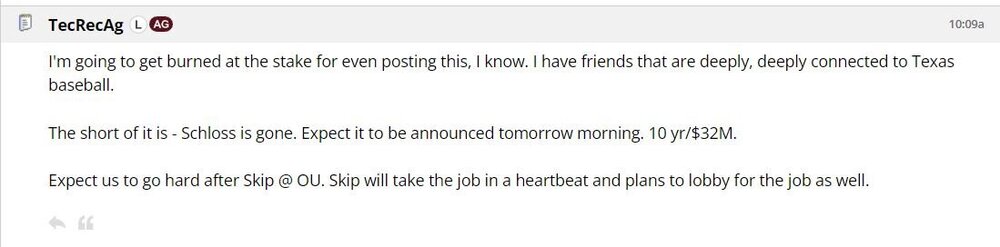 16. I can see why some said this could bleed over into football recruiting. A&M had to fire Schloss' assistants mid season to save money and can't afford the stadium upgrades for baseball cause Jimbo has all their money, while CDC got a 375 million dollar basketball arena built for free. Easy to sell the A&M is broke narrative.