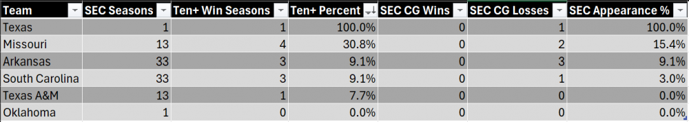 14. Wild that of the 6 teams the SEC has added since 1933 that Missouri is the clear #2 so far. If you stack up their historical marks against the other teams they only come out ahead of South Carolina. South Carolina measuring ahead of Texas A&M is pretty comical to be sure.