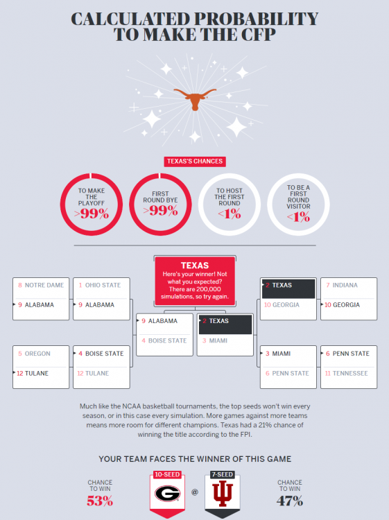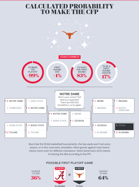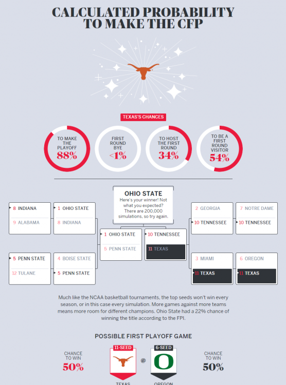 12. Playoff predictor: https://www.espn.com/espn/feature/story/_/page/cfbplayoffpredictor2024/ Scenario 1: Beat A&M & Georgia Result: Rematch with Georgia then take out Miami & Alabama Scenario 2: Beat A&M lose to Georgia Result: Open with Bama in Austin lose to Bama but lulz at them having Notre Dame win Scenario 3: Lose to A&M Result: We go to Autzen and win then upset Miami before losing to Tennessee (lulz) Observations: They seem confident that Tulane is the 12 seed (all 3 times) same with Boise State at the 4 seed. They have 4 SEC teams in all 3 scenarios with Alabama (wut?), Georgia, & Texas in all and with S Car in 1, Tenneessee in 2.