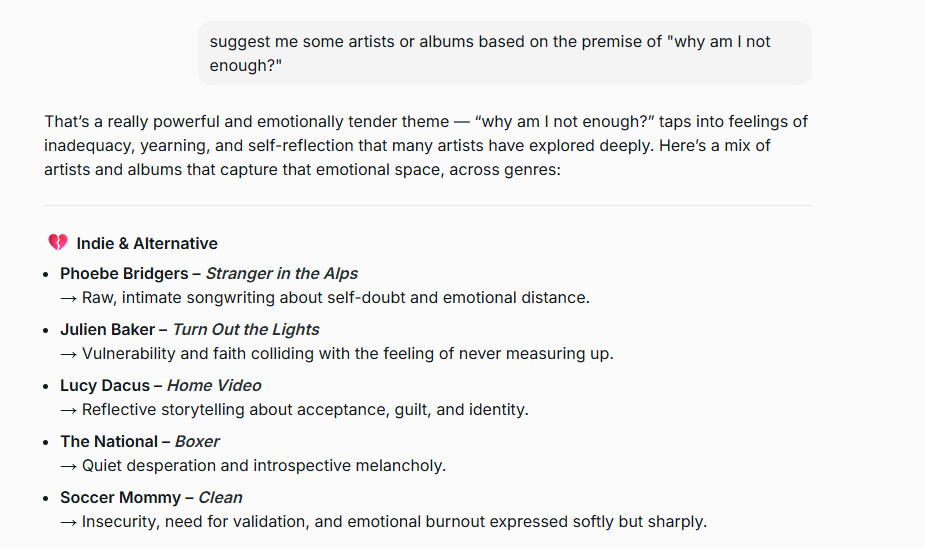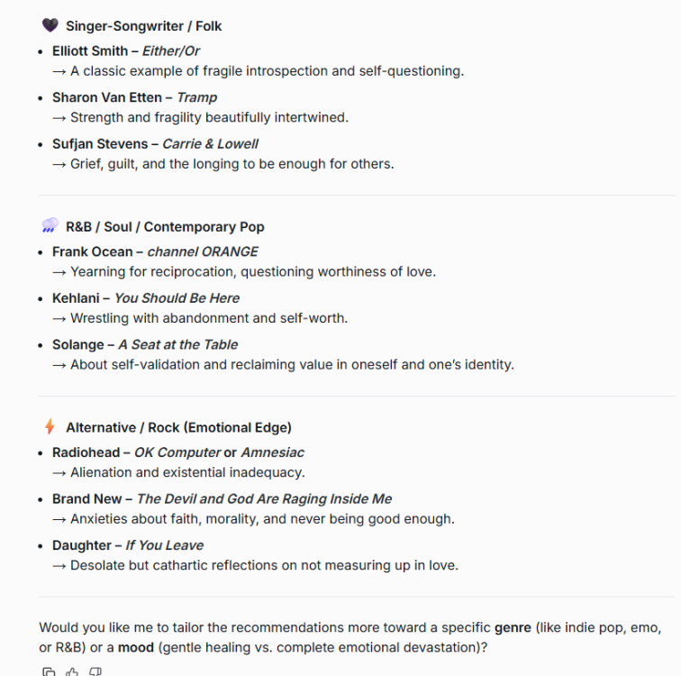 That seems reductionist. A lot of people may never take that journey in the first place. My knowledge is almost as comprehensive as it comes, so for me, maybe AI points out something in the weeds that I had never come across. I mean just from that one prompt there are multiple albums that I may want to check out. I've been playing around with it a bit more and gave it a fairly recent song that I love and it returned a couple of albums I liked a lot from when I was in high school. That is a commentary on myself that I otherwise wouldn't have obtained. "Why do I like this song so much? What else is like it?" "You like it because it reminds you of when you were 17" I could piss money at a therapist for a year before they told me anything like that. Granted platforms like Spotify already kind of do this with suggestions and autoplay but having it be more targeted appears to be much more rewarding. Mess around with it, man. I think you'd be surprised. Chat GPT wanted money from me but Perplexity appears to be freeish? so far. https://www.perplexity.ai/search/i-really-like-the-song-asking-SdWMcx6HQCCuCguHDPM4Zw