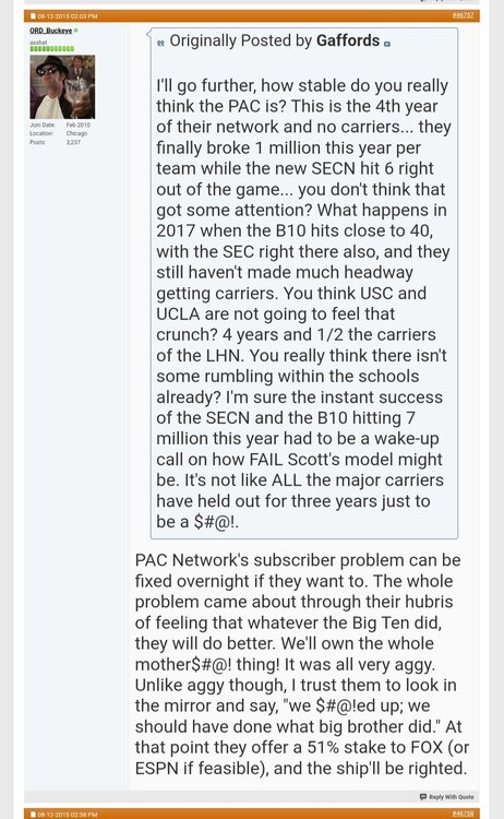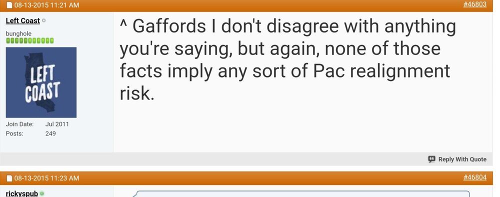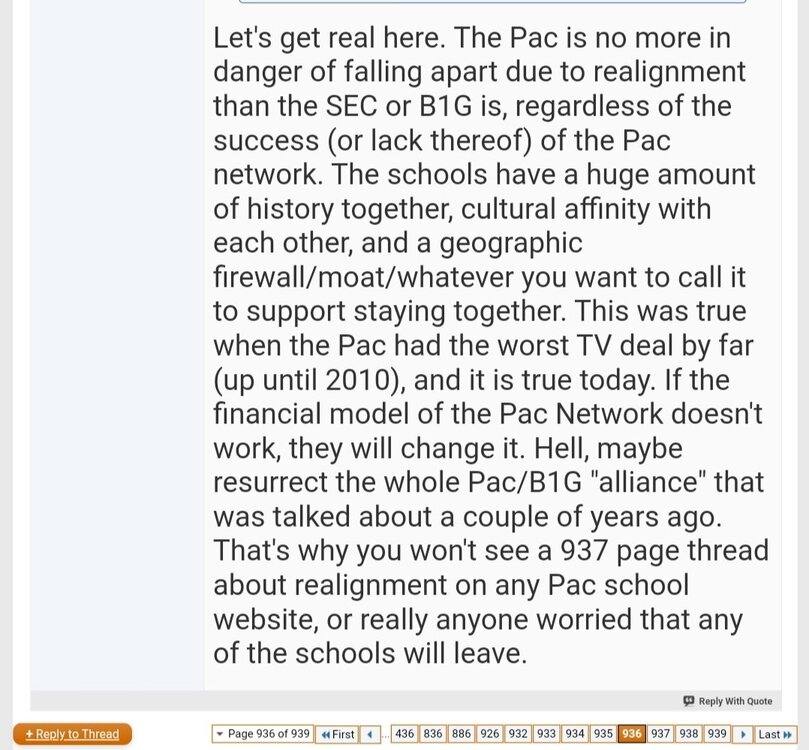 There are a bunch of posts I made back then, and even further back to when the PAC let Texas, Texas Tech, OU and OSU slip away. But (I think) most of me going on about the PAC going to come unravelled starts around page 935 of the realignment thread, if anyone wants to verify my posts on archived web pages.