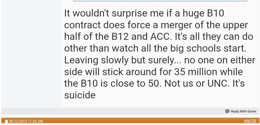 NOTE. I didn't say the B12 and ACC would merge, I said it wouldn't surprise me if they did, because they would lose their workhorses if they didn't do something to protect themselves.  B12 lost UT/OU, PAC lost USC/UCLA, and now Clemson/FSU/ect are on the clock.  Stay competitive in football, or try to compete with half the others budget.