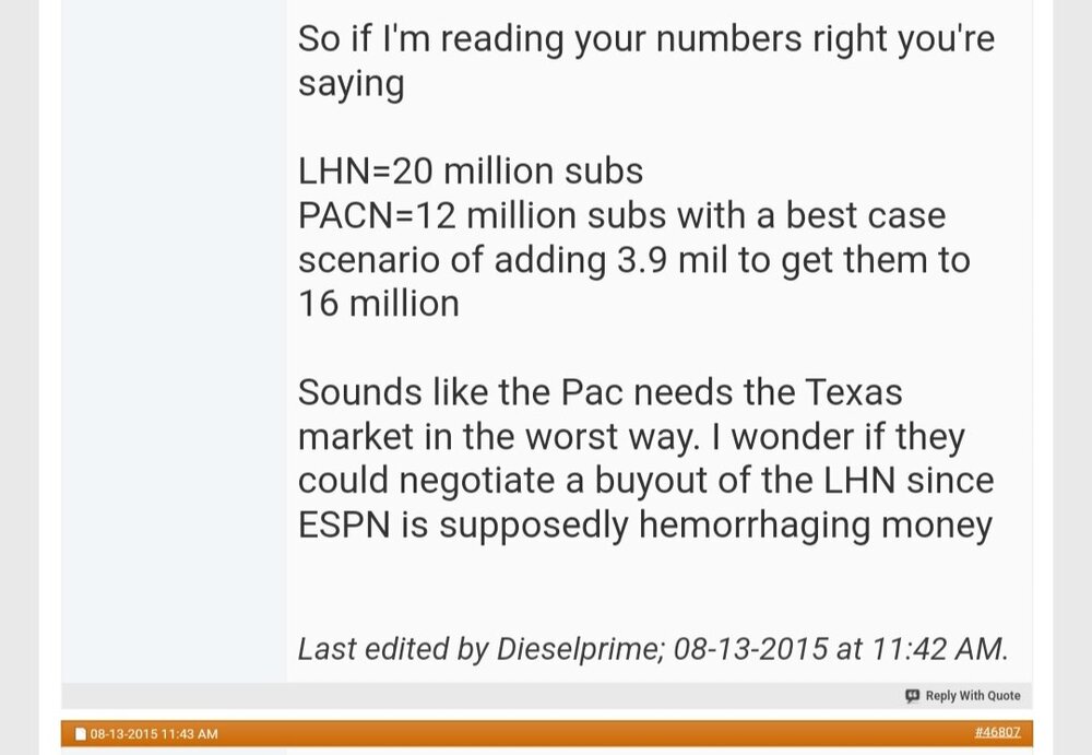 My post was about the time of the AT&T buyout of Direct TV, so there were some lengthy posts responses how the buyout would fix the carrier issues for the PACNET, which led to my own lengthy posts explaining why the buyout wasn't the magic wand most assumed it was. AT&T wasn't coming in to roll over, since they had all the leverage., And Scott was too arrogant to admit his master failure of a plan, needed a lifeline. He'd hadn't budged with the other National carriers, so I didn't see him doing so with his last hope either.